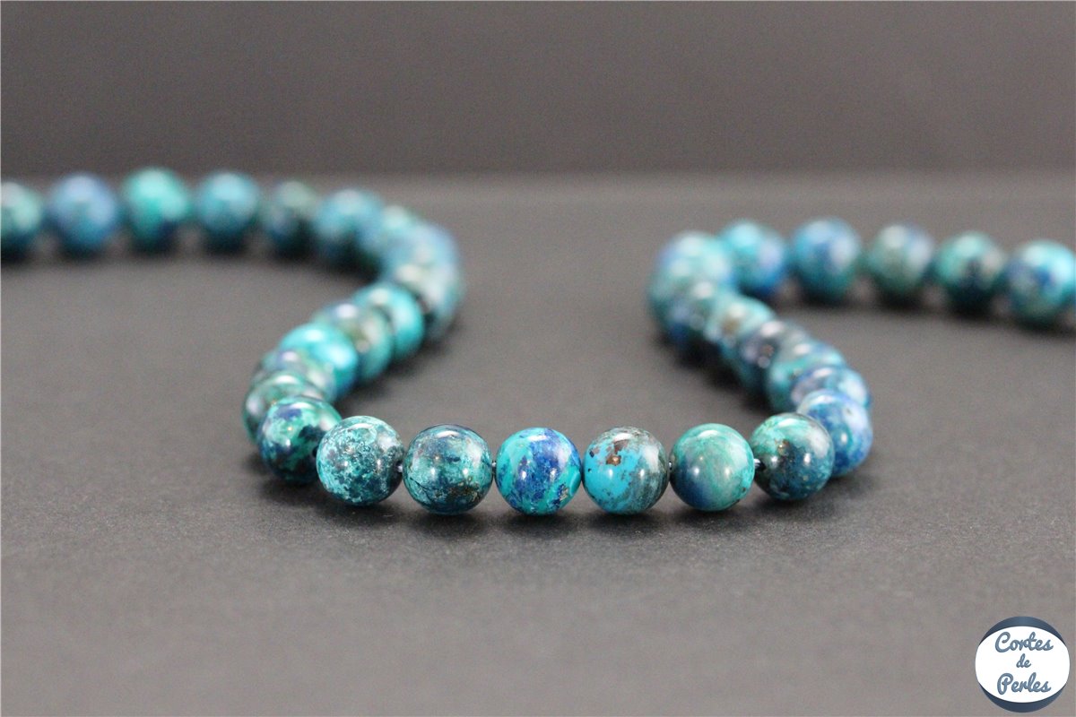 Exceptionnelles perles lisses et rondes en chrysocolle naturelle d'Afrique du Sud - Grade AA - Diamètre entre 8 et 8.5mm environ, selon les rangs - Diamètre du trou 1mm - Perles peu communes, excellente qualité - Idéales pour une utilisation en lithothérapie - Prix pour un rang de 37 cm