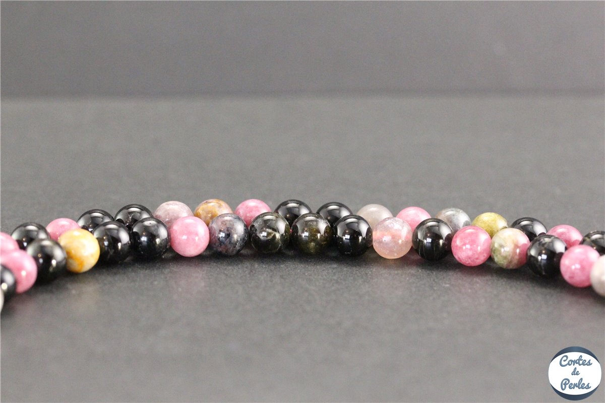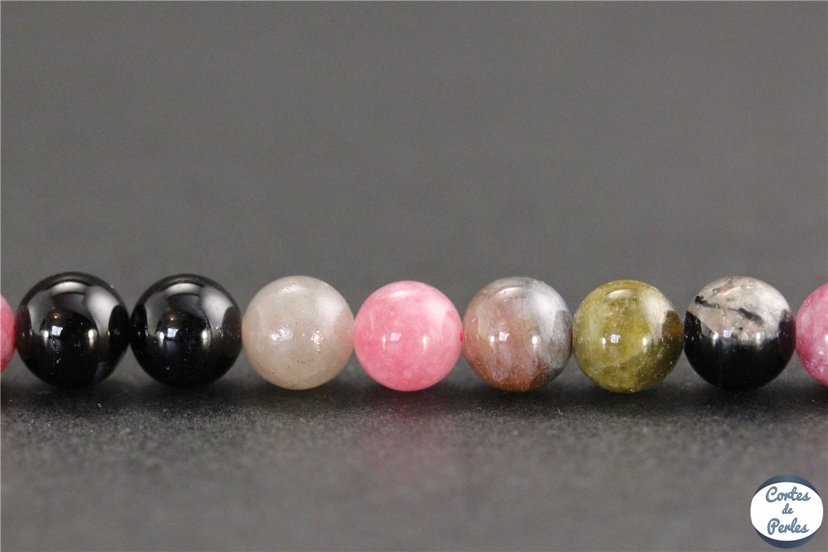 La tourmaline est une pierre de la famille des silicates que l'on trouve à l'état naturel sous forme de cristaux multicolores, avec de très belles nuances allant du noir au rose en passant par le vert. Les principaux gisements actuellement en exploitation se trouvent en Afrique et en Amérique du Sud. Cette pierre est depuis longtemps très prisées en bijouterie fantaisie, et ses nombreuses propriétés en font un must de la lithothérapie. En effet, la tourmaline, de part ses propriétés électriques exceptionnelles, est connue pour être la pierre de protection par excellence. Elle est particulièrement recommandée aux personnes stressées qui ont des problèmes de sommeil, et se combine assez bien avec d'autres pierres, comme le quartz ou la labradorite. Nous vous proposons dans cette section nos perles en tourmaline naturelle de Madagascar, parfaites pour agrémenter vos créations de bijoux fantaisie ou vos bijoux pour lithothérapie.