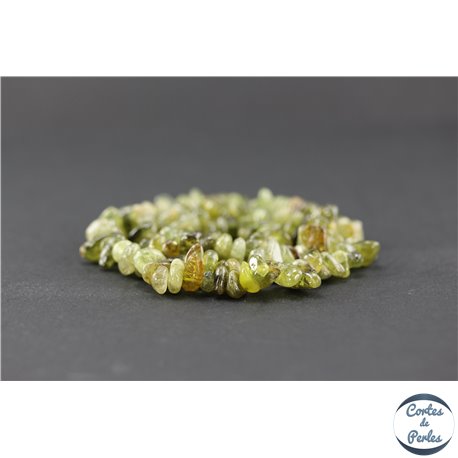 Perles de grenat vert naturel en forme de chips - Longueur entre 5 et 12 mm environ - Largeur entre 4 et 10 mm environ - Epaisseur entre 3 et 8 mm environ - Diamètre du trou 1 mm - Qualité entrée de gamme - Prix pour un rang de 38 cm