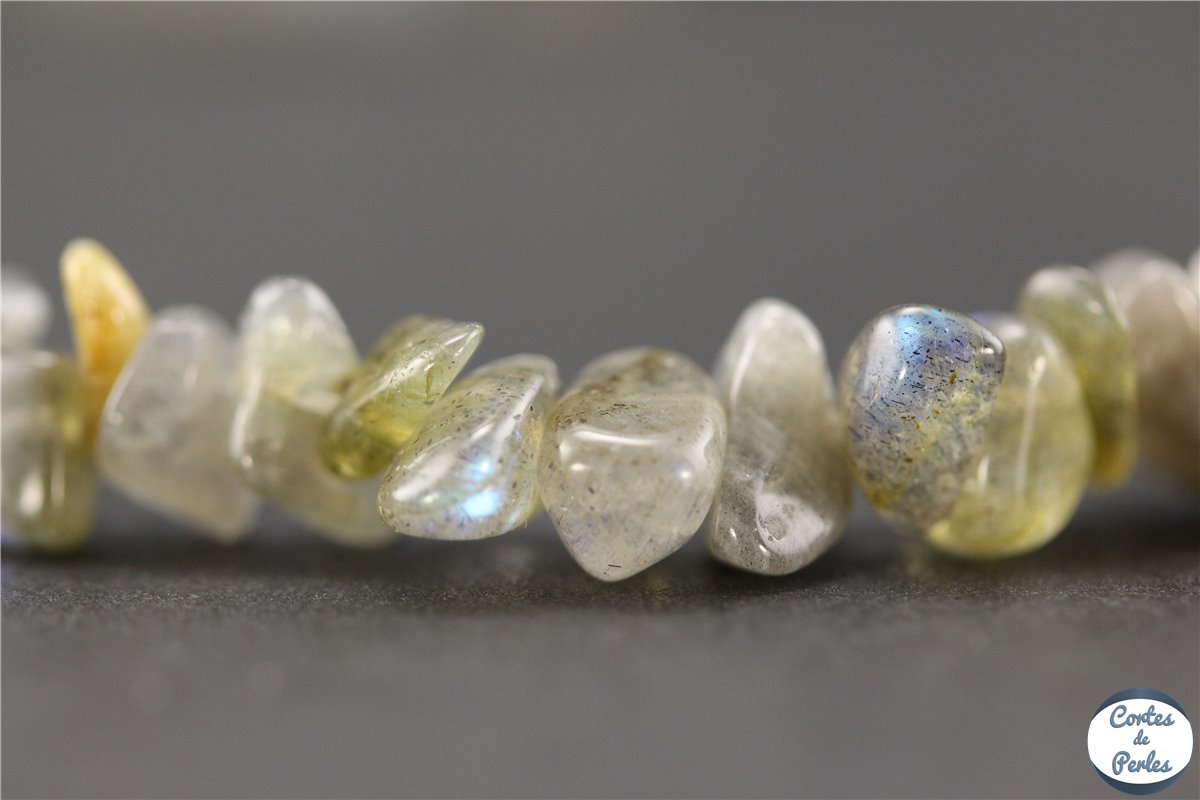 Perles en labradorite naturelle en forme de petites pépites - Très beaux eflets irisés gris bleutés - Prix sacrifié - Longueur 8 mm - Largeur 5 mm - Trou 1 mm - Prix pour 1 rang