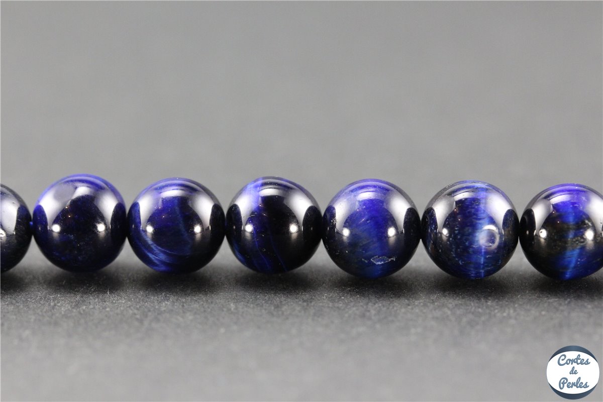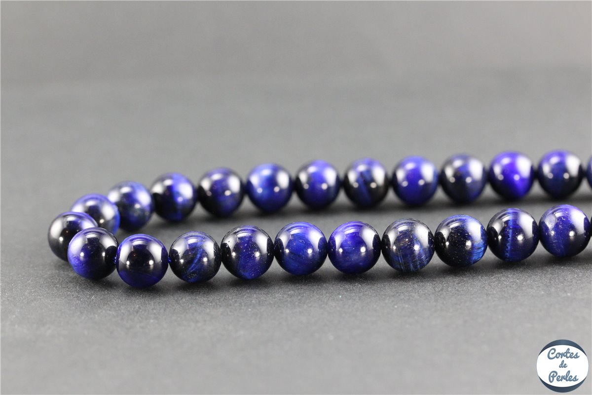 Très belles perles lisses et rondes d'oeil de tigre teintées, avec de très beaux reflets bleu roi - Grade A - Diamètre 10 mm environ - Diamètre du trou 1 mm - Excellente qualité - Prix pour un rang de 38 cm