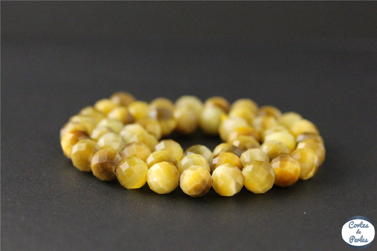 Jolies perles rondes à facettes en oeil de tigre doré naturel - Grade A - Diamètre 8mm environ - Diamètre du trou 1mm - Belle qualité - Parfaites pour une utilisation en lithothérapie - Prix pour un rang de 38cm environ