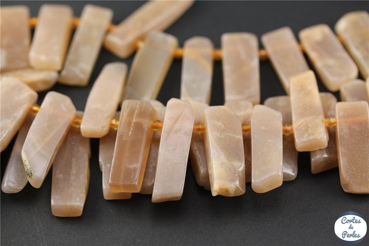Très belles perles lisses de pierre de Soleil naturelle en forme de rectangles - Longueur entre 20 et 45 mm environ - Largeur entre 8 et 16 mm - Épaisseur entre 5 et 9 mm - Diamètre du trou 1 mm - Top qualité et formes peu communes pour des créations des plus originales - Prix pour un rang d'environ 29 perles