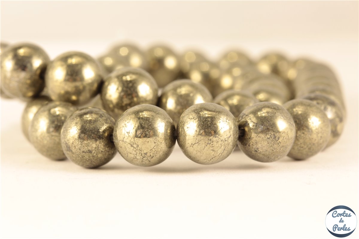 Très belles perles lisses rondes de pyrite naturelle - Grade AB - Diamètre 10mm - Diamètre du trou 1mm - Qualité exceptionnelle, parmi nos plus belles perles de pyrite - Prix pour un rang d'environ 40 perles